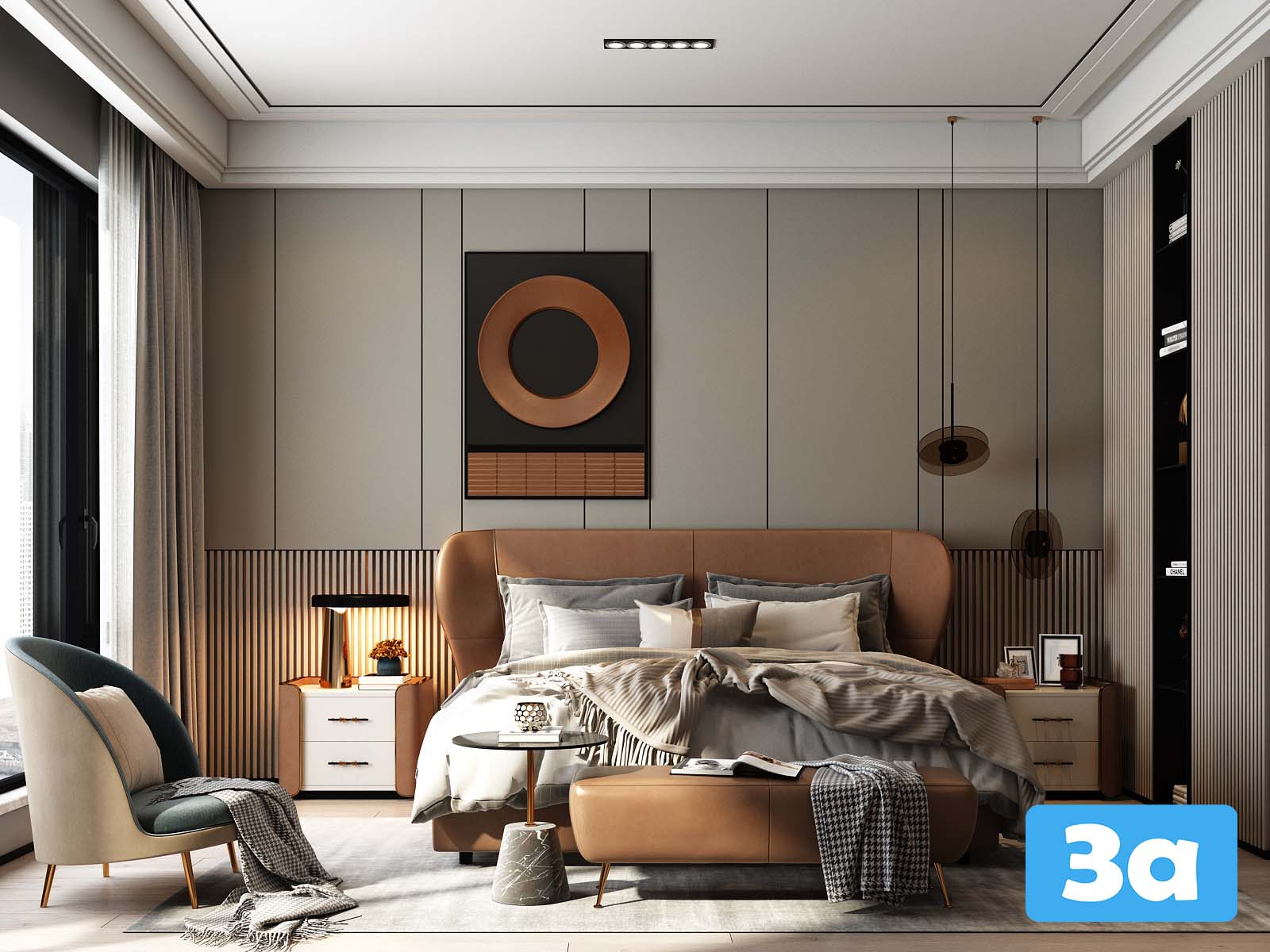 This 3D scene showcases a modern bedroom design with stylish furniture and interior layout. Explore the details and layout of this contemporary bedroom setting.