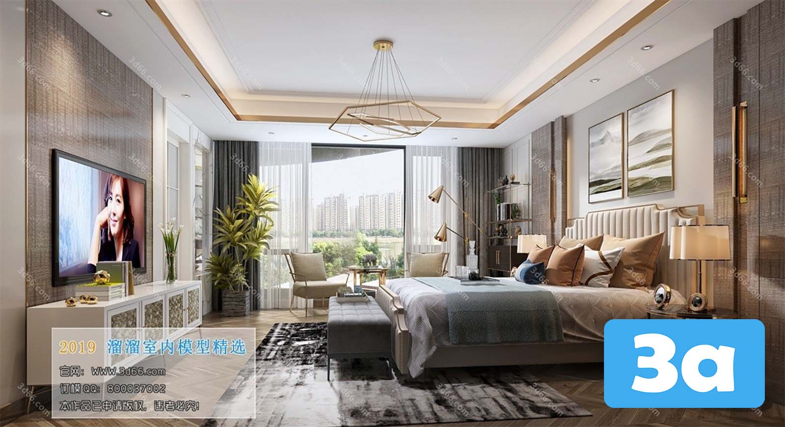 This 3D scene showcases a modern bedroom design with stylish furniture and interior layout. Explore the details and layout of this contemporary bedroom setting.