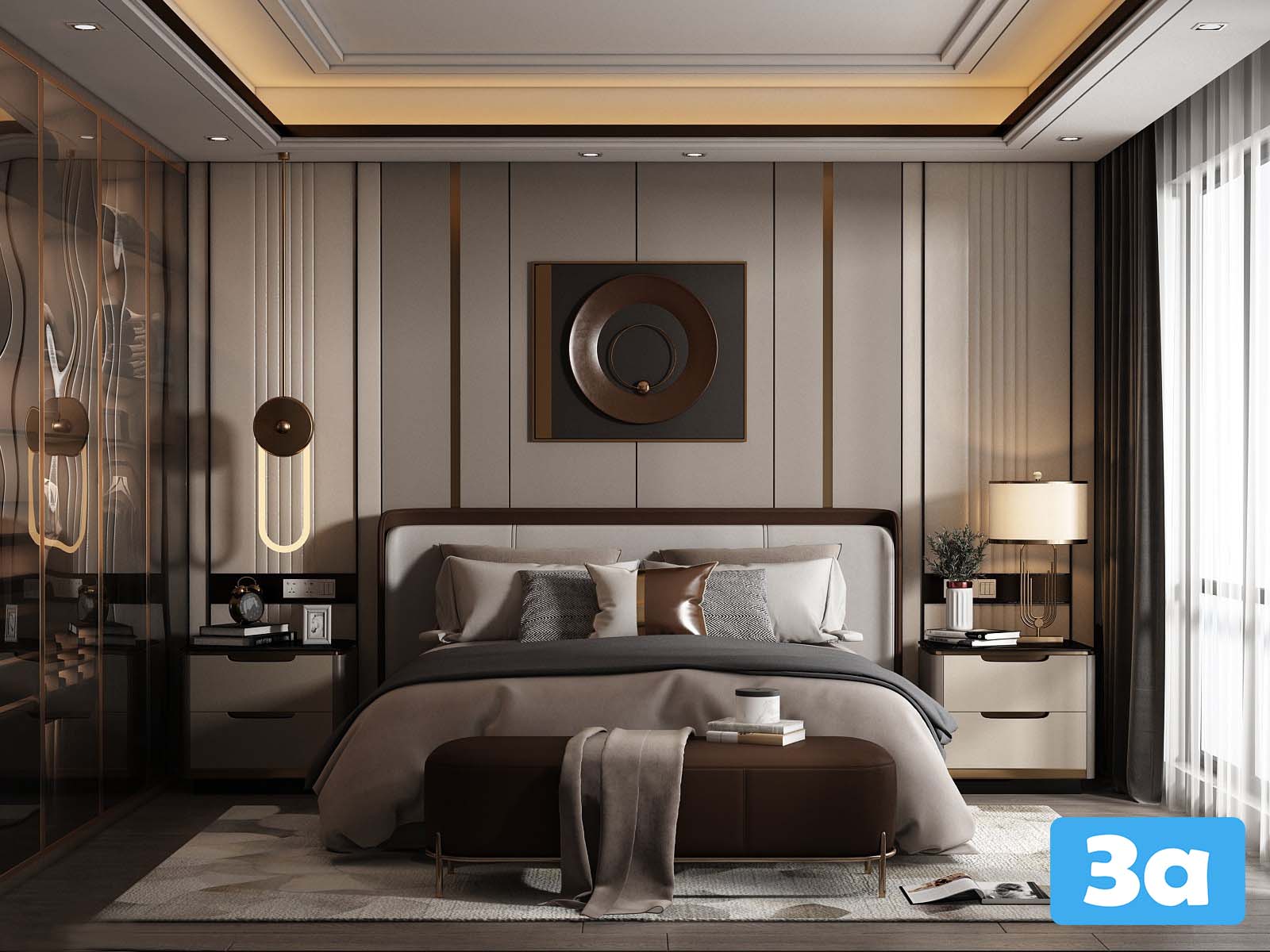 This 3D scene showcases a modern bedroom design with stylish furniture and interior layout. Explore the details and layout of this contemporary bedroom setting.