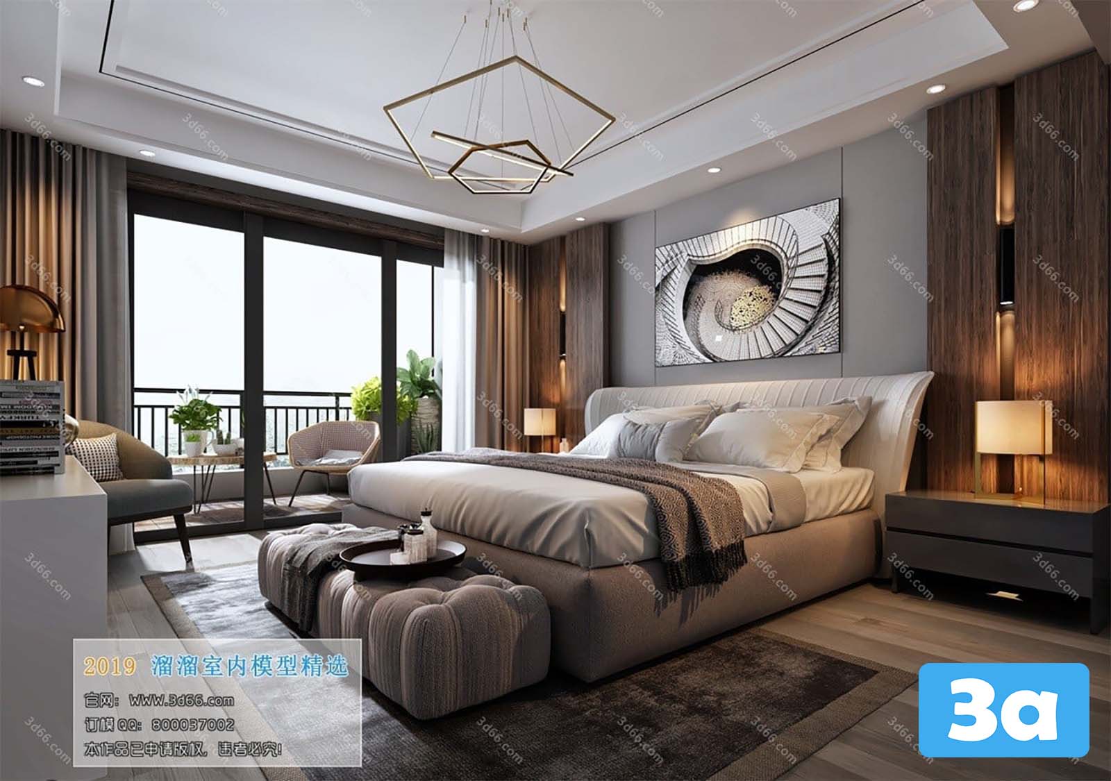 This 3D scene features a modern bedroom with contemporary furniture and decor. The design is sleek and stylish, showcasing a blend of modern aesthetics and functionality. Explore this bedroom scene to get inspiration for your own interior design projects.