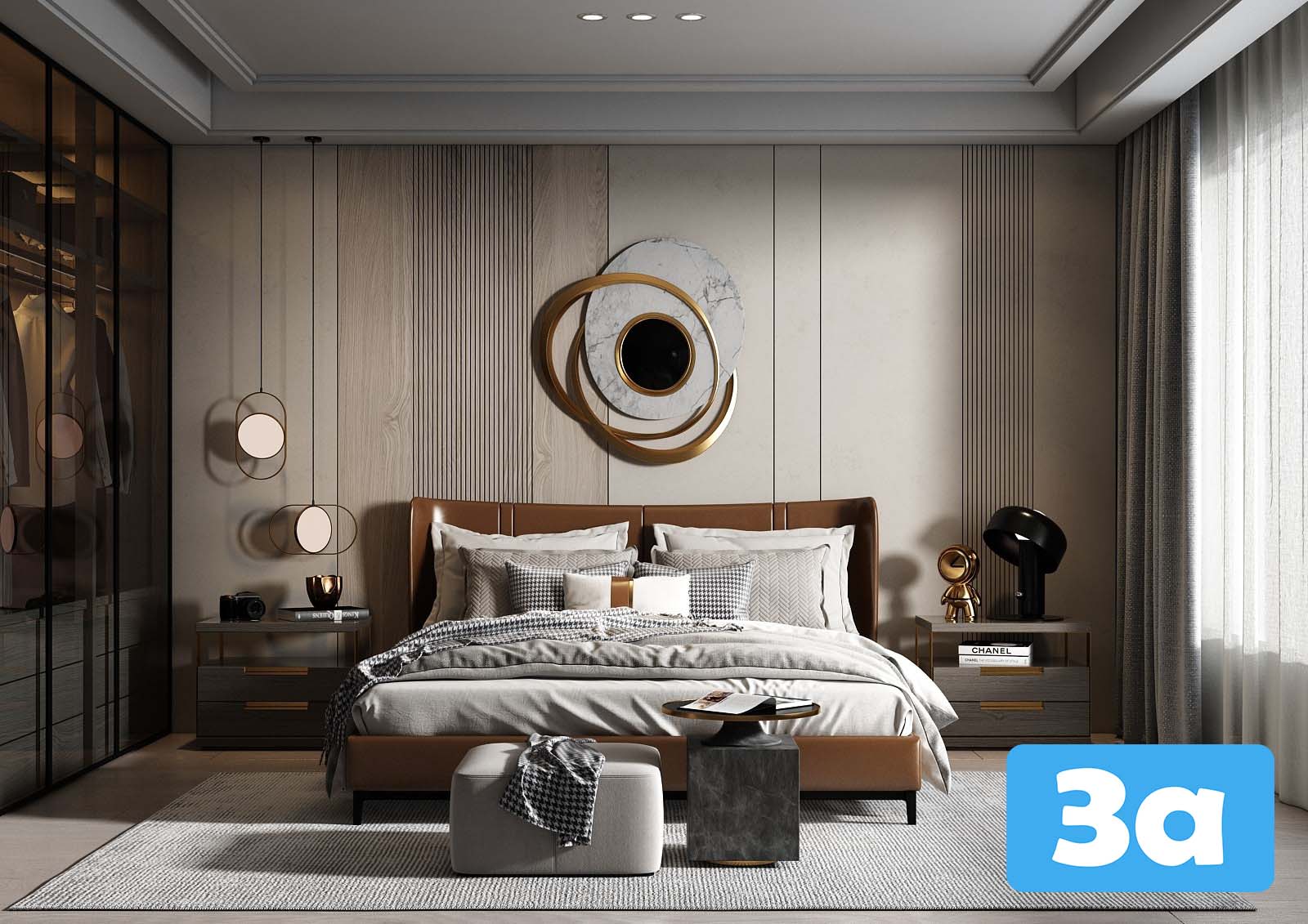 This 3D scene showcases a modern bedroom design created in Sketchup. It is ideal for interior design professionals, architects, and enthusiasts looking for inspiration. The scene features contemporary furniture and a stylish layout, perfect for visualizing interior spaces.
