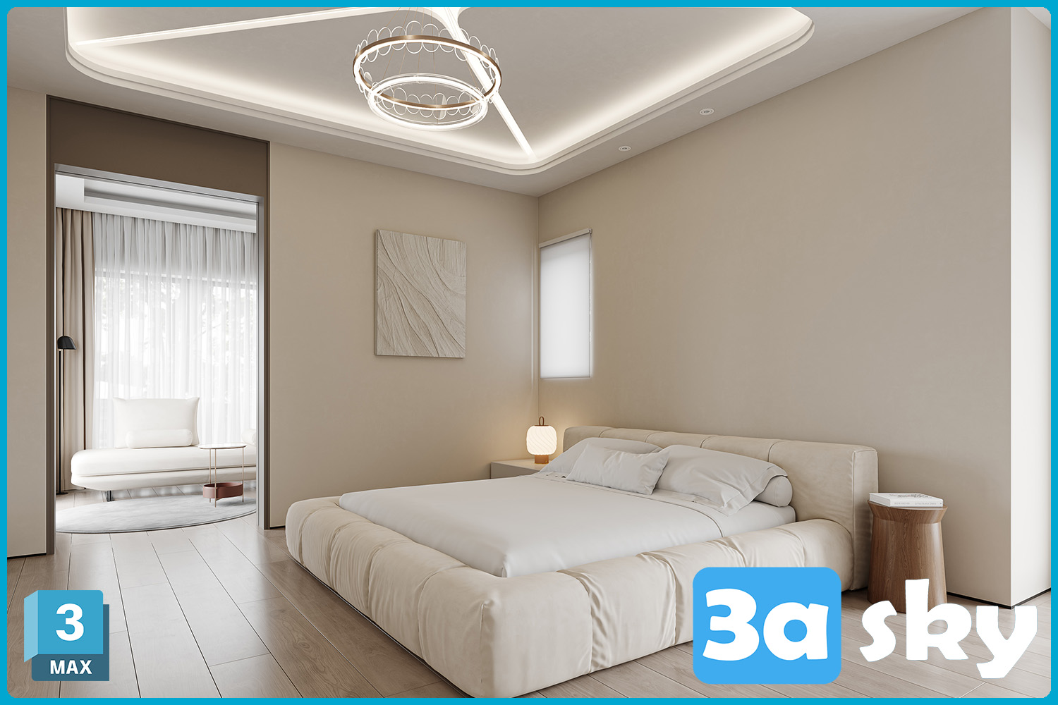 This 3D scene features a modern bedroom setup, ideal for interior design projects and architectural visualization. The scene is created with attention to detail, providing a realistic and immersive experience. Perfect for showcasing furniture, lighting, and decor elements in a contemporary bedroom setting. Download this high-quality 3DS MAX/3D scene to enhance your design projects.