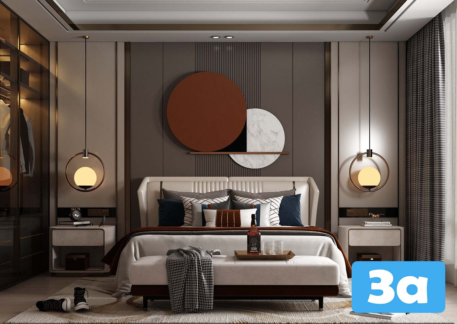 This 3D scene features a modern bedroom with contemporary design elements and furniture. The room is elegantly designed with a focus on simplicity and functionality. The color scheme is neutral with pops of color in the decor. The furniture pieces are sleek and stylish, creating a cozy and inviting atmosphere. Perfect for showcasing modern interior design concepts.