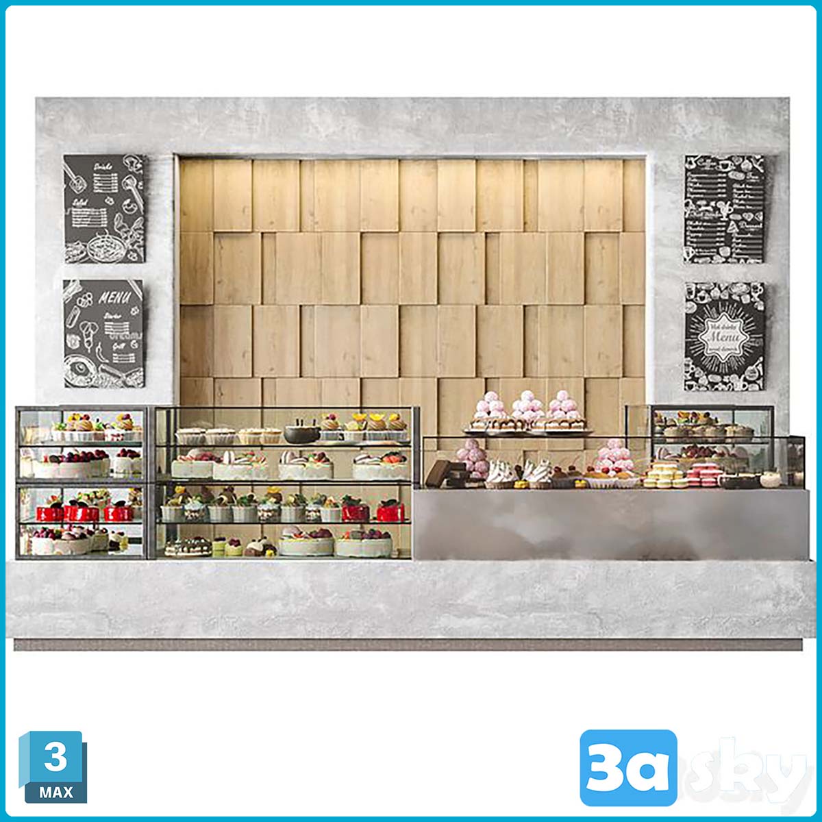 This 3DS MAX/KITCHEN file showcases a modern coffee shop with a display area. The design features a contemporary layout with attention to detail. Explore the interior design elements and get inspired for your own projects.
