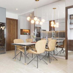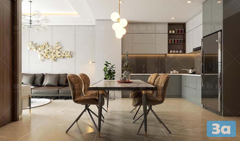 This 3D scene features a modern dining room with a focus on interior design. The room is elegantly furnished with contemporary furniture and stylish lighting fixtures. The design creates a welcoming and sophisticated atmosphere, perfect for dining and entertaining guests. Explore this scene for inspiration on modern interior design concepts.