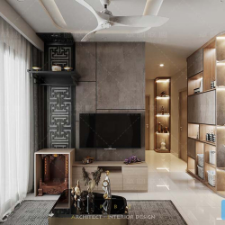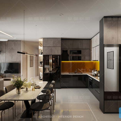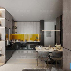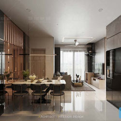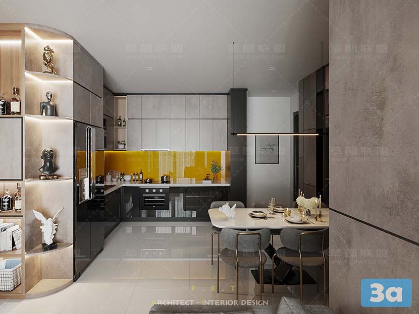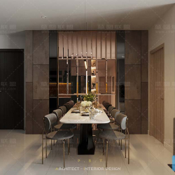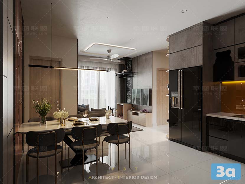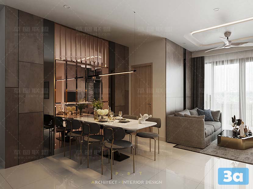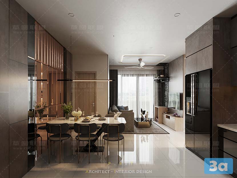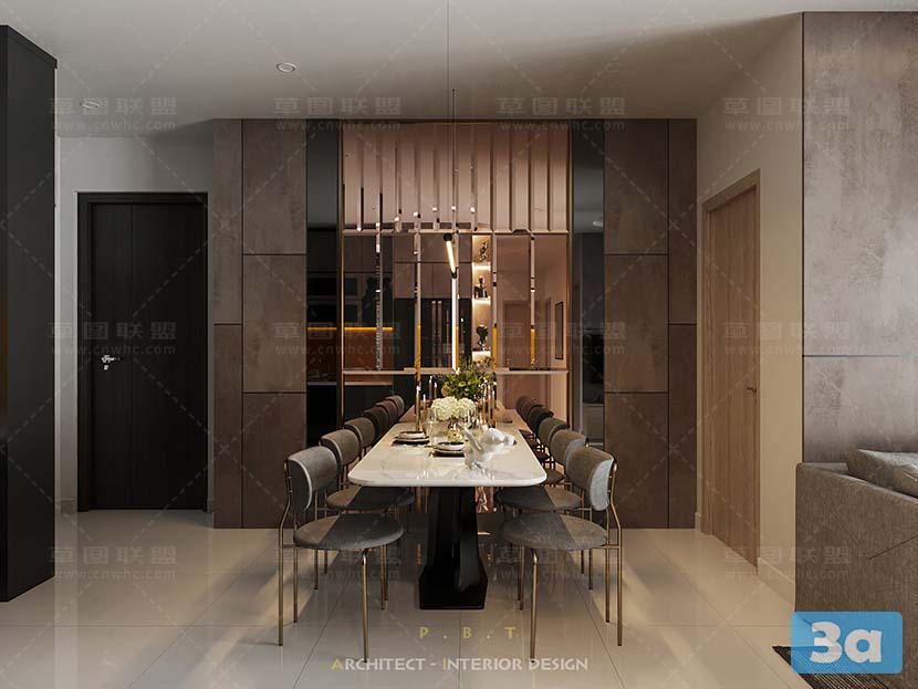 This 3D scene features a modern dining room with a focus on interior design. The room is elegantly furnished with modern furniture pieces and stylish lighting fixtures. The design exudes a contemporary and sophisticated vibe, perfect for those seeking inspiration for their own interior design projects.