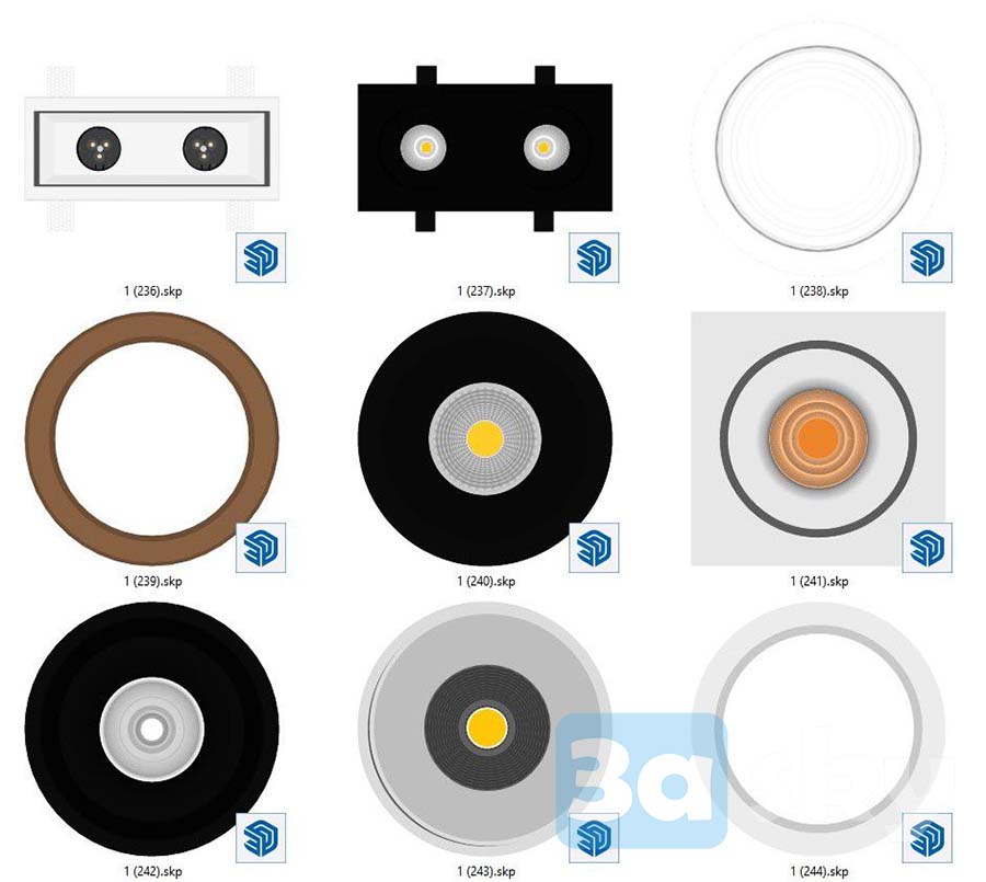 This Sketchup lighting design showcases a modern downlight with model number 1022 27. The sleek and contemporary design of the downlight provides a stylish lighting solution for various spaces. Explore this 3D model to find the perfect lighting option for your project.