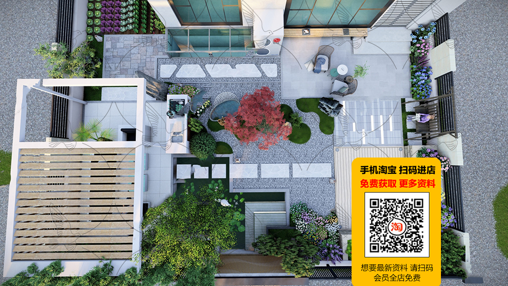 This 3D scene showcases a modern garden courtyard with elegant landscaping and contemporary design elements. The outdoor space is thoughtfully arranged with a focus on aesthetics and functionality. The 3D model provides a detailed representation of a stylish and inviting garden setting, perfect for architectural visualization and design inspiration.