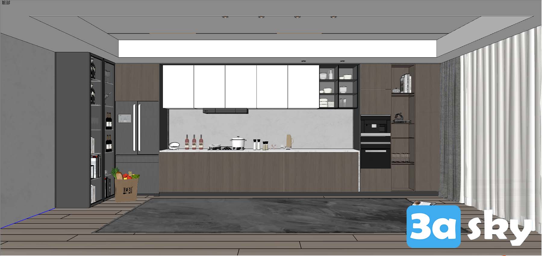 This 3D scene showcases a modern kitchen design with a contemporary layout. The kitchen features stylish furniture and appliances, creating a sleek and functional space. Explore this preview to get inspired for your own kitchen design project.