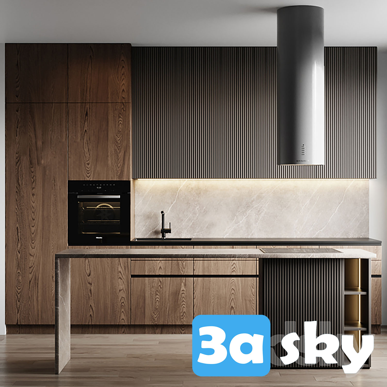 This 3D model showcases a modern kitchen design created in 3DS MAX. The design features contemporary elements, sleek furniture, and a stylish interior layout. Explore the intricate details of this kitchen design and get inspired for your own projects.