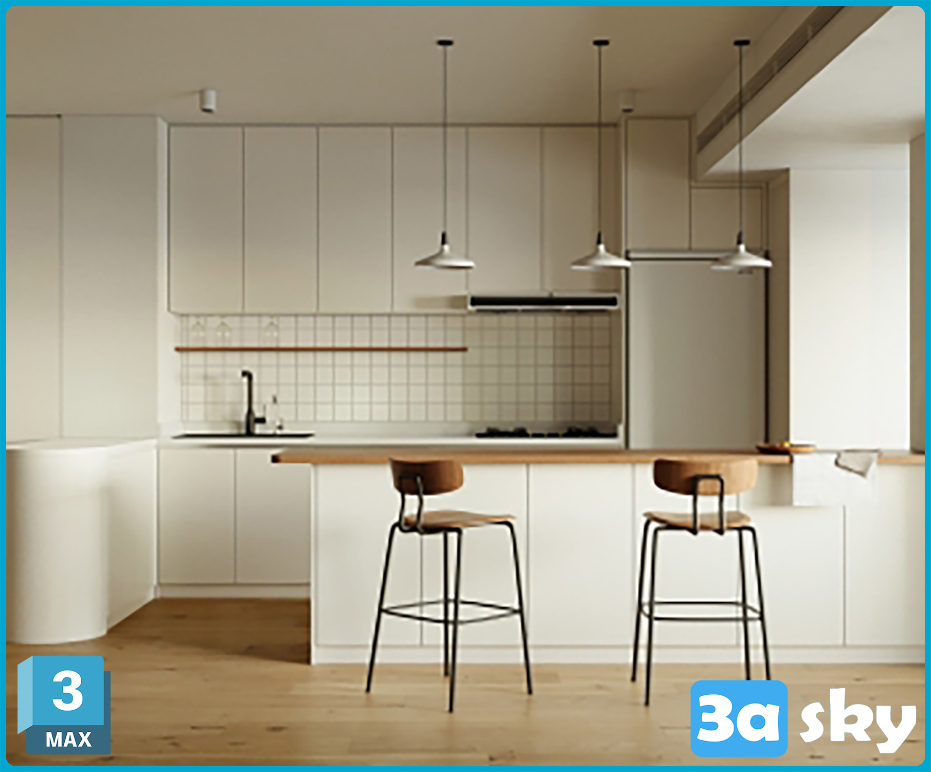 This 3DS MAX kitchen design showcases a modern and sleek interior layout. The design features contemporary elements and a stylish color scheme. Explore this 3D model to get inspiration for your own kitchen design projects.