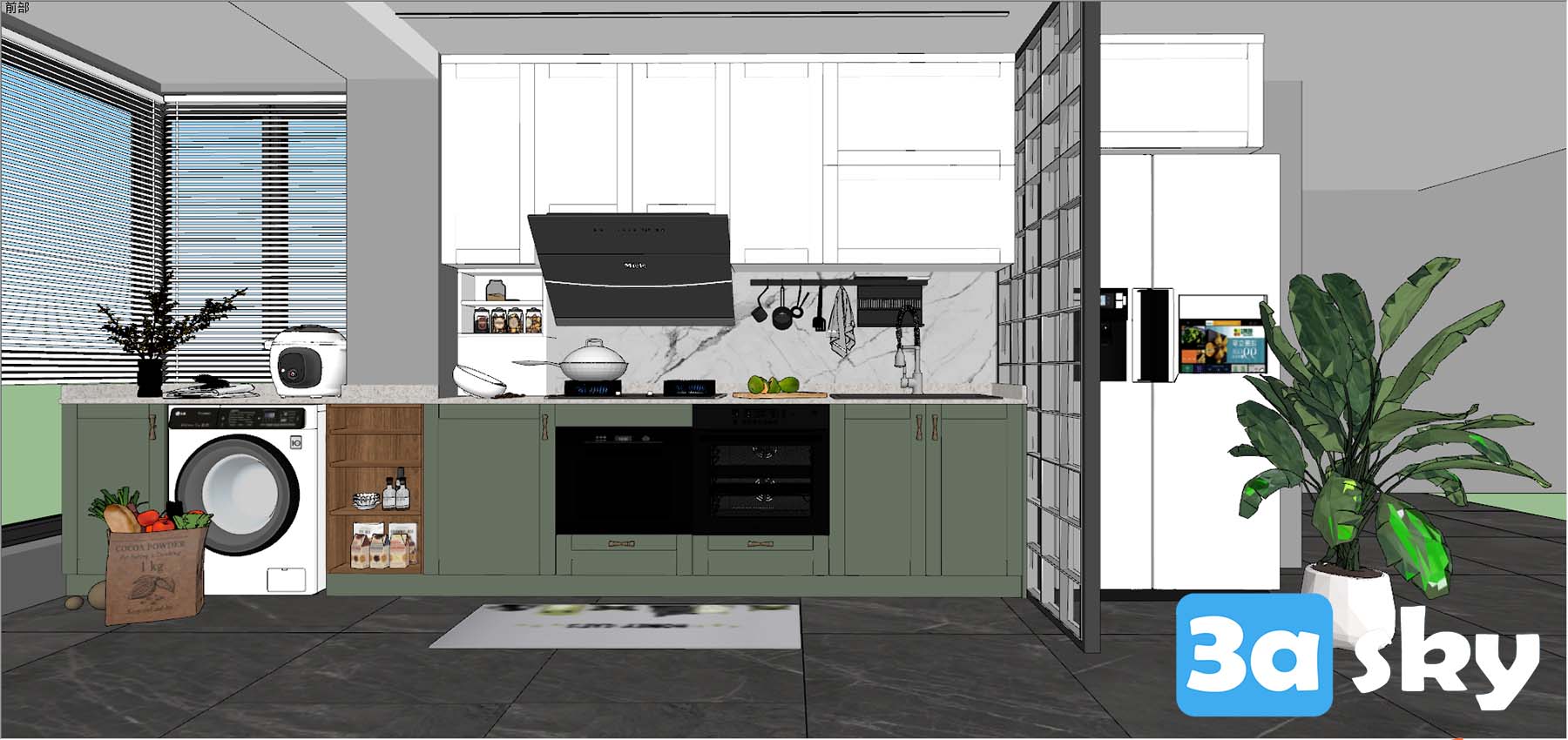 This 3D scene showcases a modern kitchen design with sleek furniture, contemporary appliances, and stylish interior elements. The setup features a blend of functionality and aesthetics, creating a visually appealing and practical kitchen space. Explore the details of this design to gather inspiration for your own kitchen renovation or interior design project.