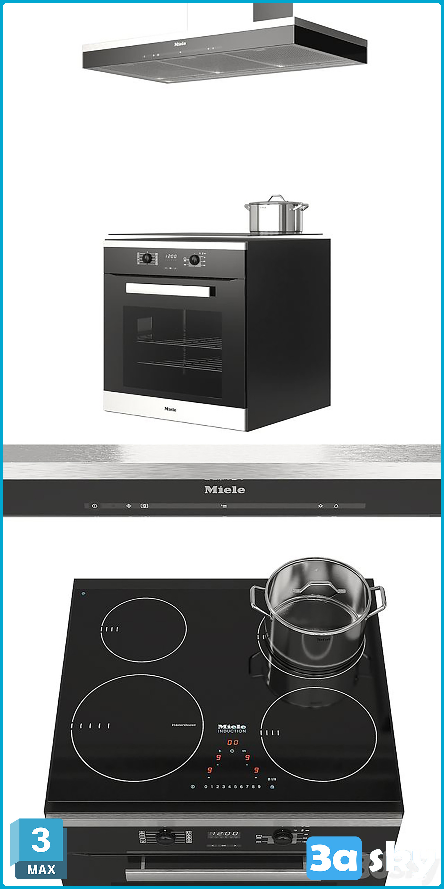 This 3D model showcases a modern kitchen design with high-end Miele appliances. The layout is sleek and stylish, perfect for contemporary homes. Explore the intricate details and functionality of the kitchen space in this visually appealing design.