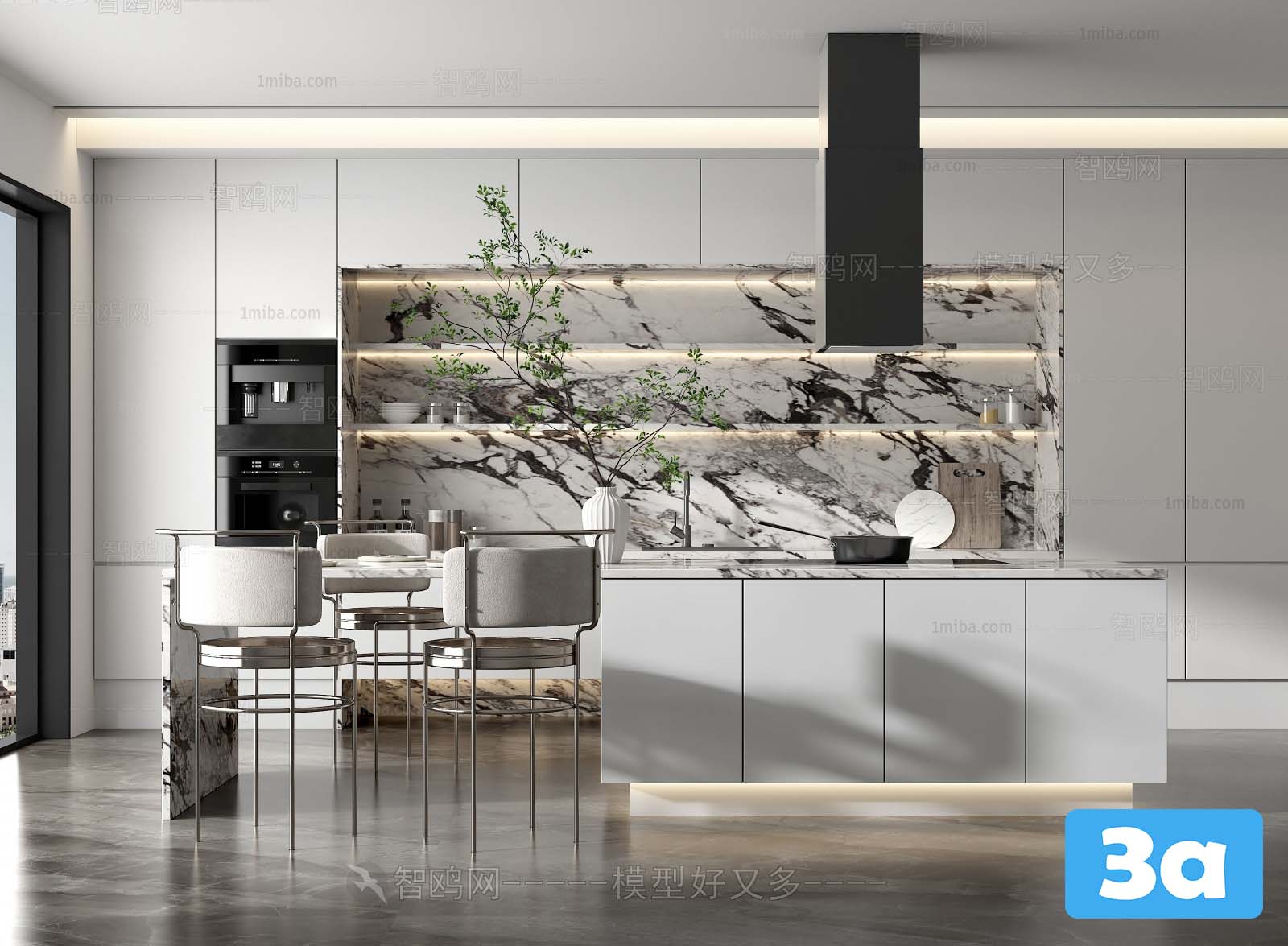 This 3D scene features a modern kitchen design with contemporary furniture and appliances. The detailed model provides a realistic representation of a stylish kitchen interior.