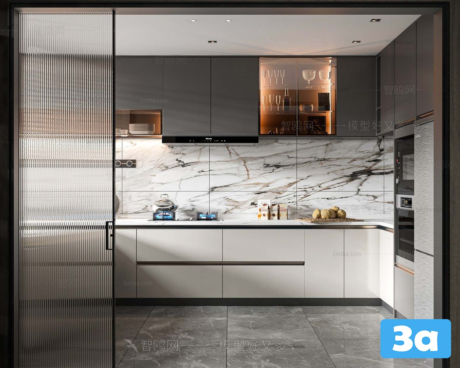 This 3D scene showcases a modern kitchen design with sleek furniture and appliances. Explore the layout and design elements in detail.