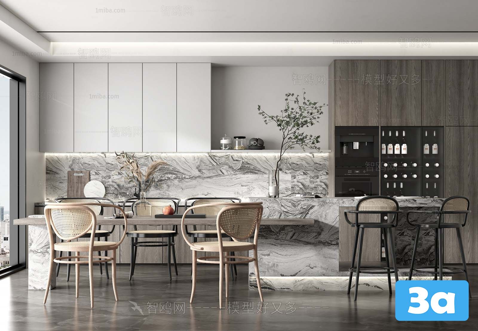This 3D scene features a modern kitchen design with contemporary furniture and interior elements. The scene is meticulously crafted to showcase a stylish and functional kitchen space. Explore the details of this 3D model to inspire your own interior design projects.