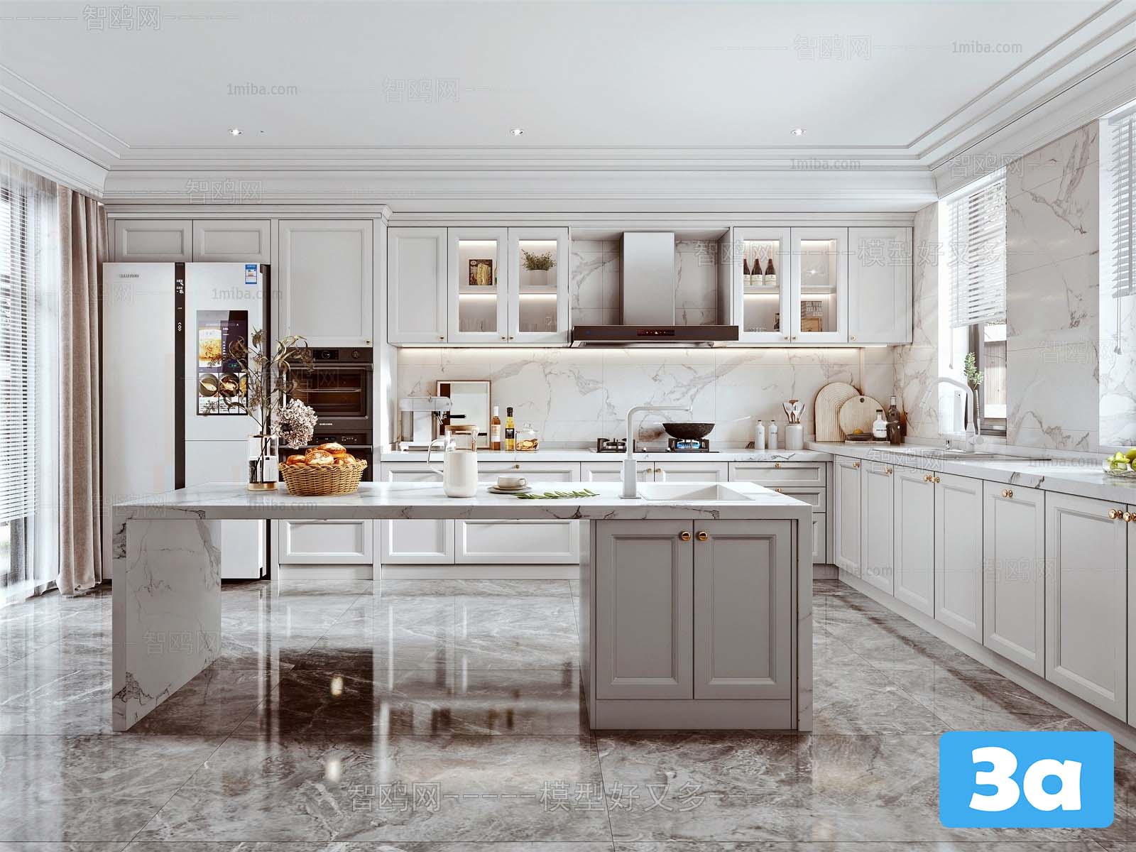 This 3D scene showcases a modern kitchen design with sleek furniture and appliances. Explore the layout and design elements in detail.