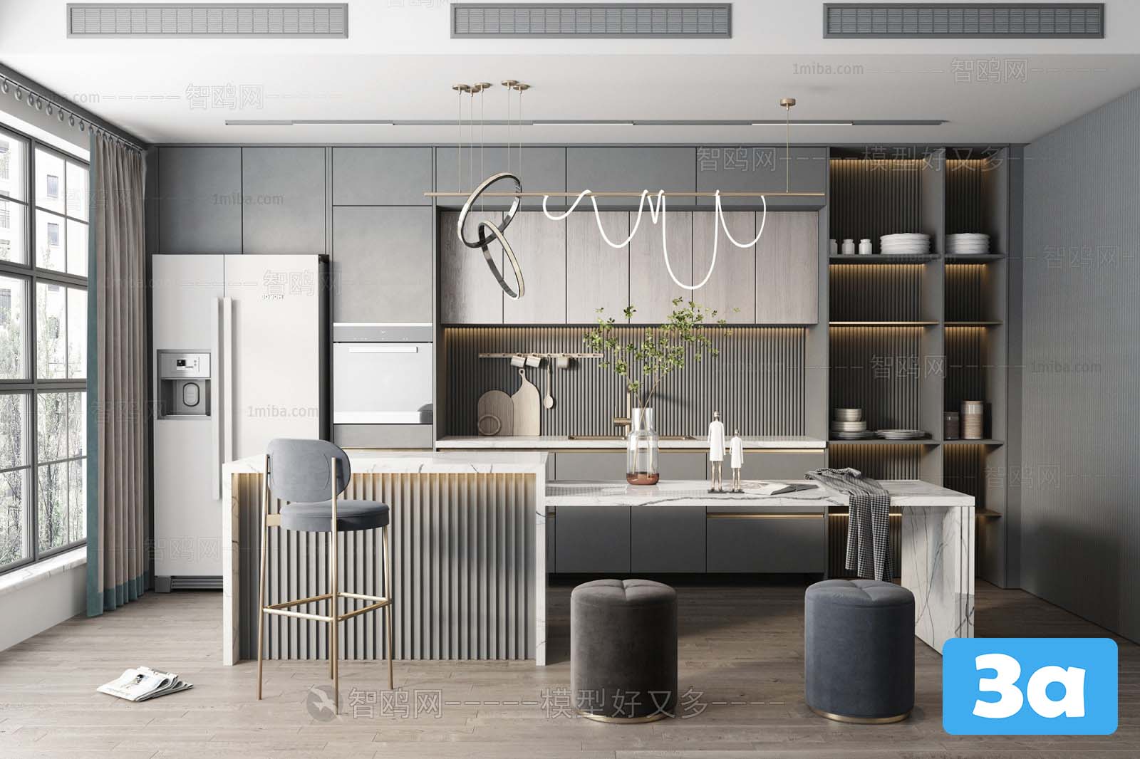 This 3D scene features a modern kitchen design with sleek lines and contemporary elements. The kitchen is well-equipped with modern appliances and stylish decor. Explore this detailed 3D model to get inspiration for your own kitchen design projects.