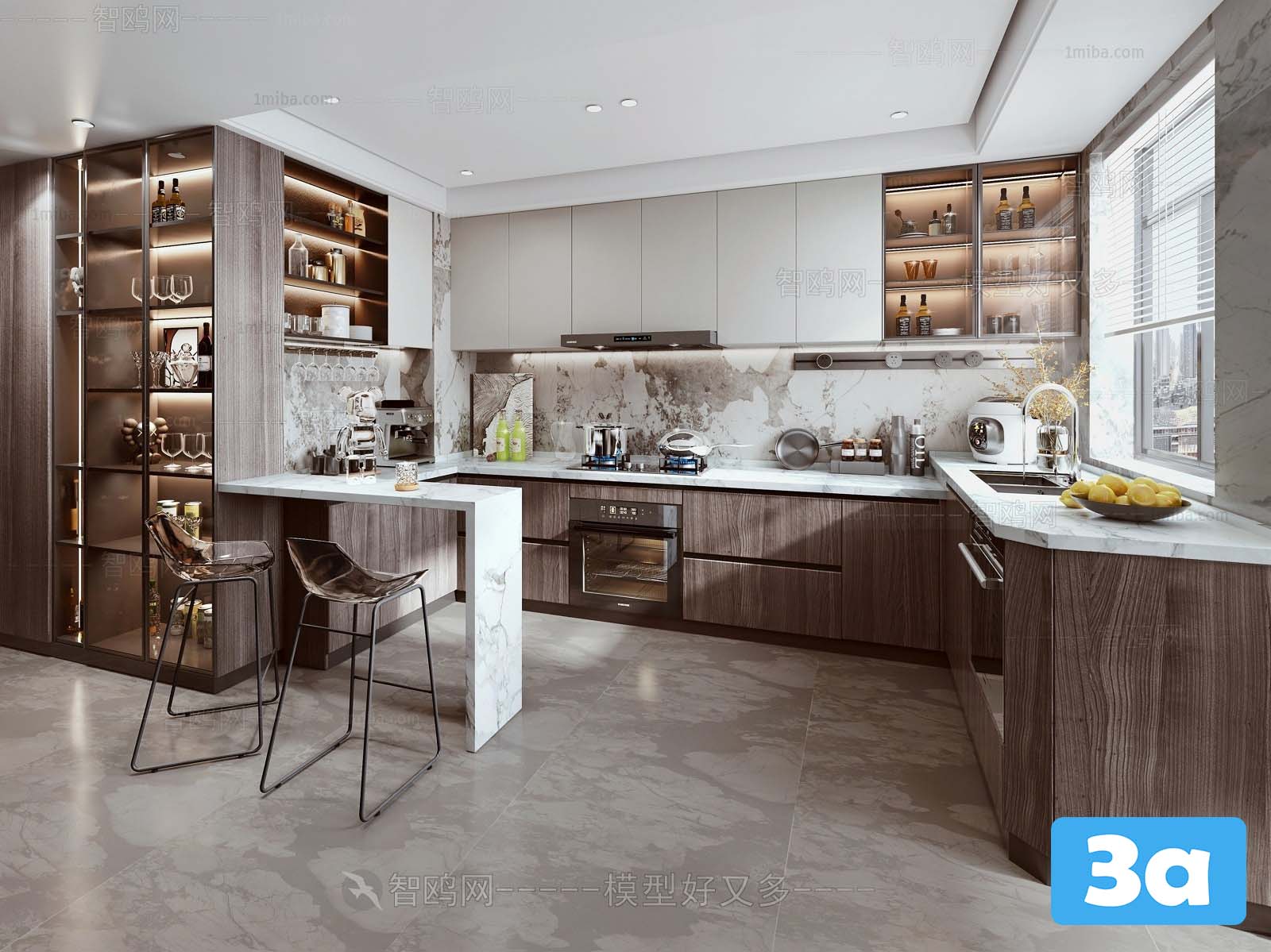 This 3D scene features a modern kitchen with a contemporary design. The layout is stylish and functional, showcasing the latest trends in kitchen interior design. Explore the details of the decor and get inspired for your own kitchen renovation or design project.