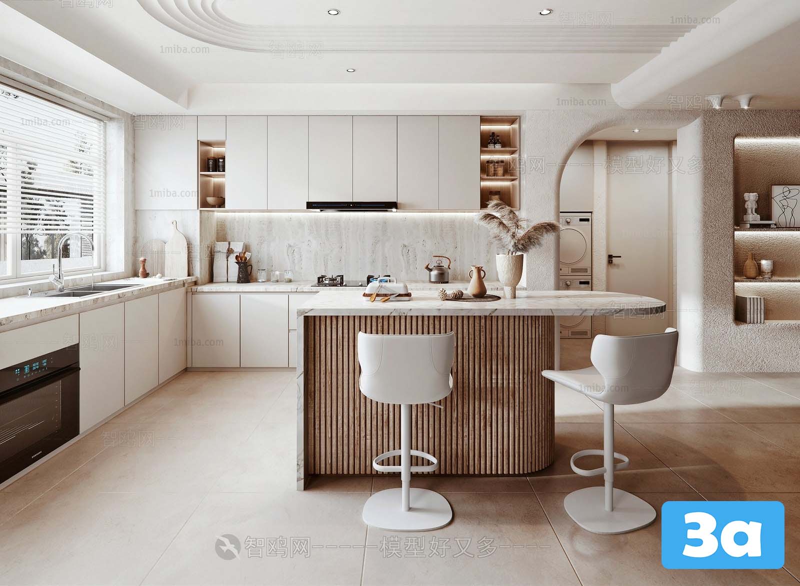 This 3D scene features a modern kitchen design with a contemporary and stylish interior. The layout includes sleek countertops, modern appliances, and a well-organized space. Explore this 3D model for inspiration in your interior design projects.
