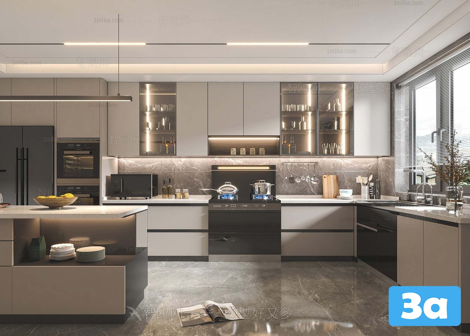 This 3D scene features a modern kitchen design with a contemporary and stylish interior. The layout includes sleek countertops, modern appliances, and a well-planned space. Explore this 3D model for inspiration in your interior design projects.