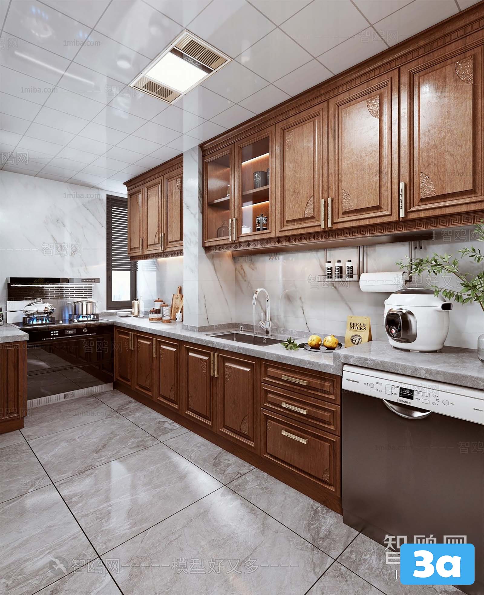 This 3D scene features a modern kitchen with a contemporary design. The layout is stylish and functional, showcasing the latest trends in kitchen interior design. Explore this 3D model to get inspiration for your own kitchen renovation or design project.