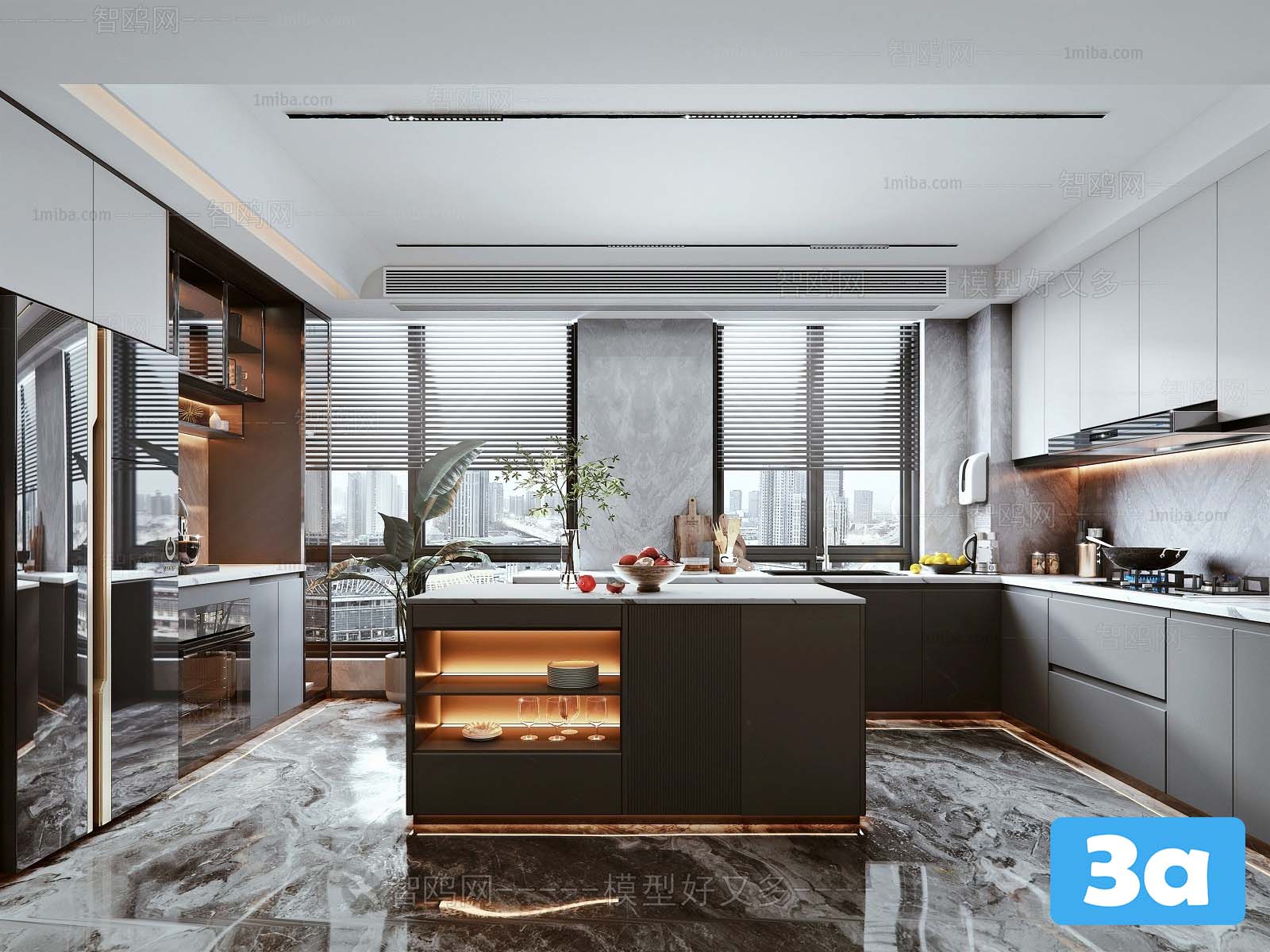 This 3D scene features a modern kitchen design with a contemporary and stylish interior. The layout includes sleek countertops, modern appliances, and a clean aesthetic. Explore this 3D model for inspiration in your interior design projects.