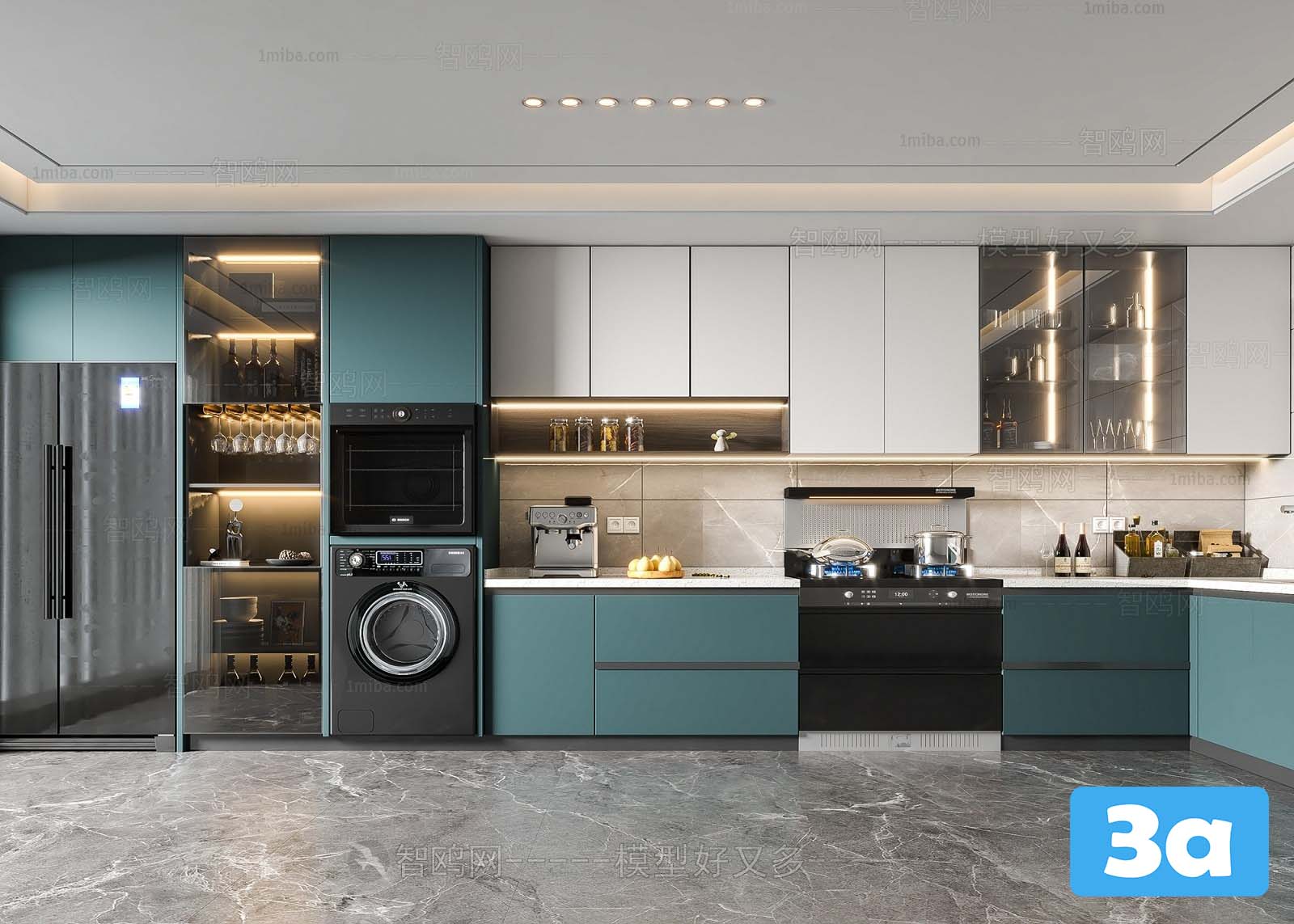 This 3D scene showcases a modern kitchen design created in Sketchup. The scene includes detailed furniture, appliances, and interior layout. Explore the intricate design elements and get inspired for your own kitchen renovation projects.