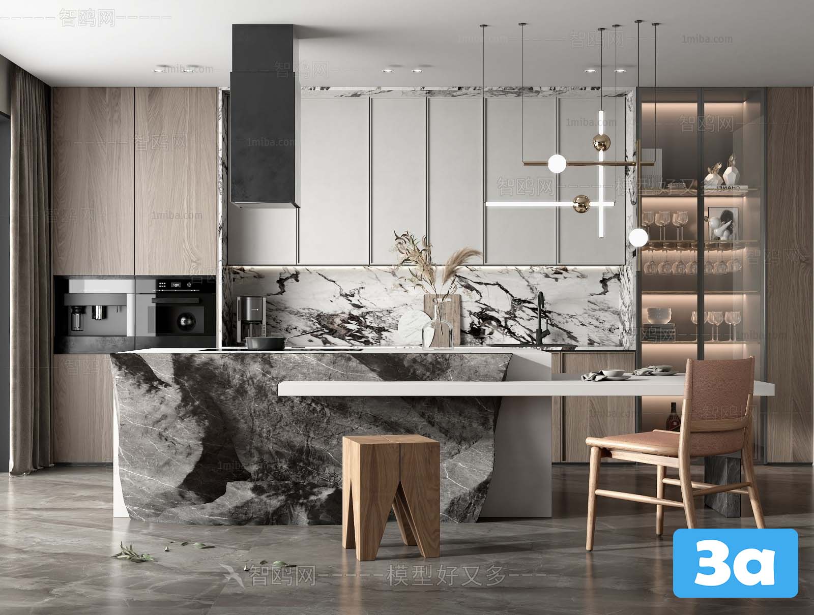 This 3D scene features a modern kitchen design with contemporary elements. The sleek and stylish interior showcases a blend of functionality and aesthetics. Explore this 3D model for inspiration in your interior design projects.