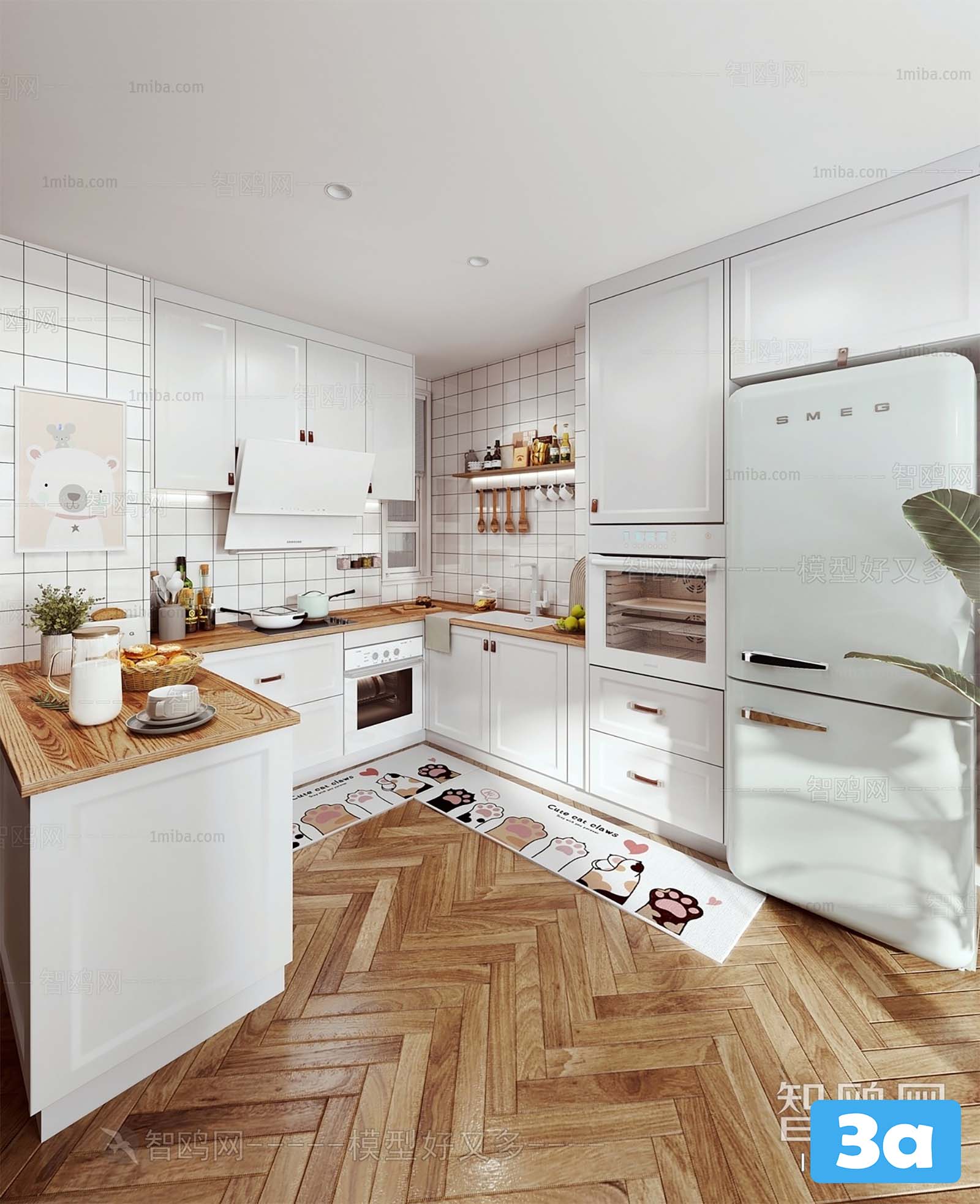 This 3D scene features a modern kitchen design with contemporary elements. The layout includes sleek cabinets, a stylish island, and modern appliances. The color scheme is neutral with pops of color for a vibrant touch. Explore this 3D model for interior design inspiration.