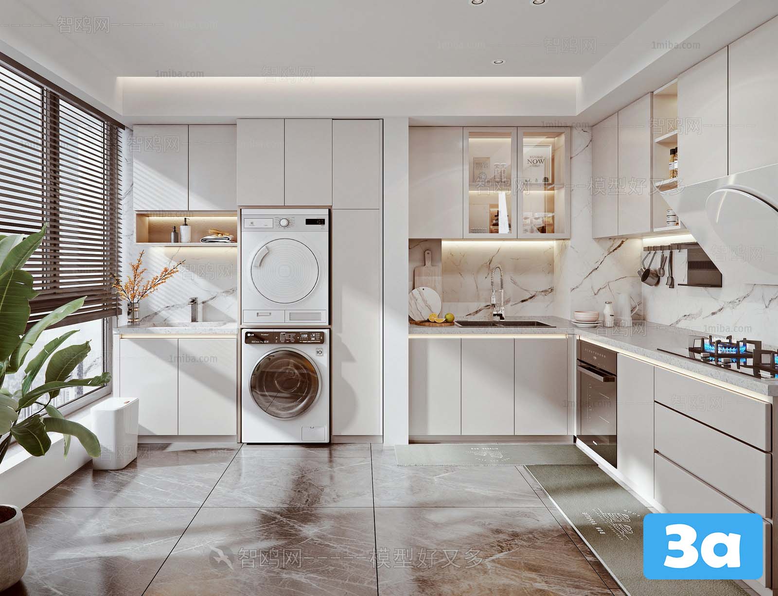This 3D scene features a modern kitchen design with contemporary elements. The layout includes sleek cabinets, a stylish island, and modern appliances. The decor is minimalistic yet functional, creating a welcoming and efficient kitchen space. Explore this 3D model for inspiration in your interior design projects.