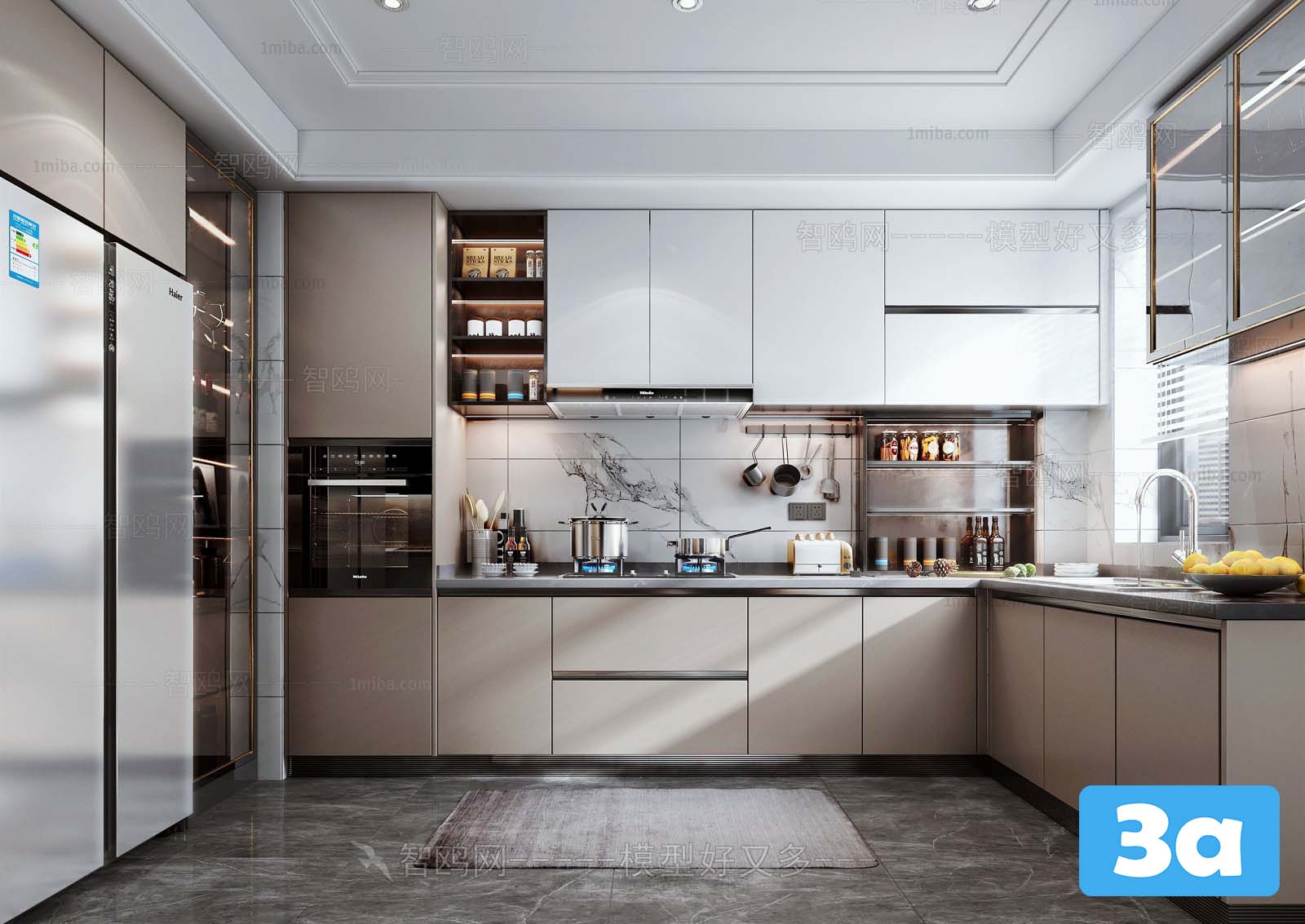 This 3D scene showcases a modern kitchen design created in Sketchup. The scene includes detailed furniture, appliances, and interior layout. Explore the intricate design elements and layout of this contemporary kitchen model.