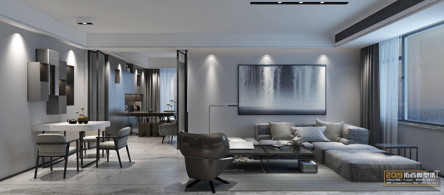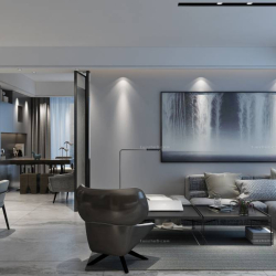 This 3D scene features a modern living room designed in a contemporary style. The room is elegantly furnished with sleek furniture and stylish decor elements. The color palette is neutral with pops of color adding visual interest. Perfect for showcasing modern interior design concepts.