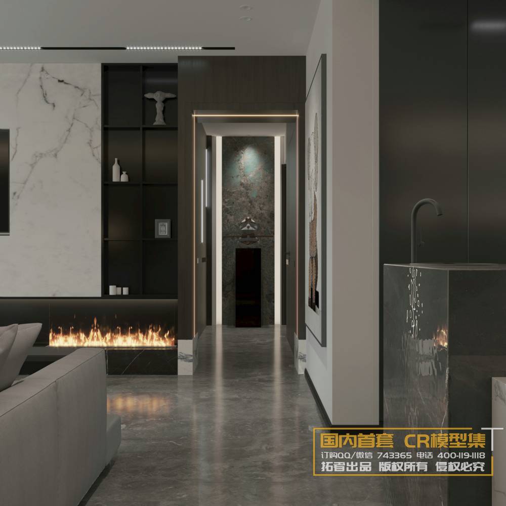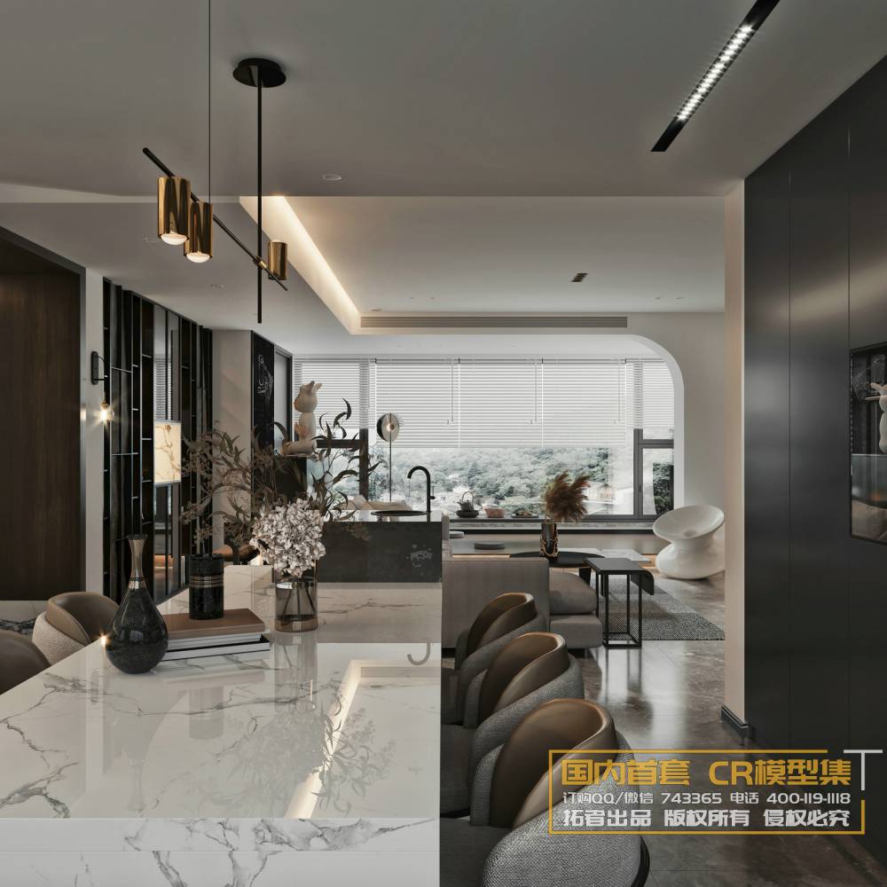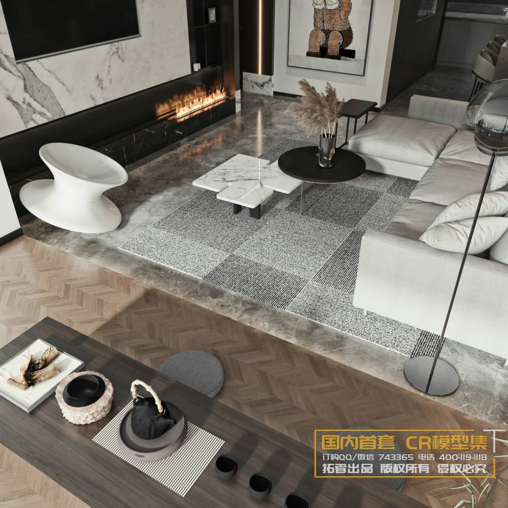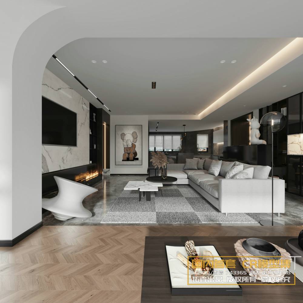This 3D scene features a modern living room designed in a contemporary style. The interior design includes stylish decor elements and a layout that exudes sophistication and elegance. Explore this 3D scene to get inspired for your own interior design projects.