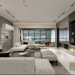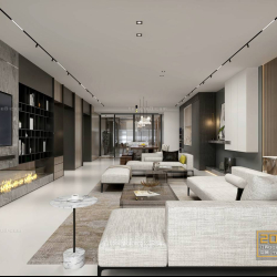 This 3D scene features a modern living room designed in a contemporary style. The interior design includes stylish decor elements and a well-thought-out layout. Explore this visually appealing space for inspiration and ideas for your own living room design projects.