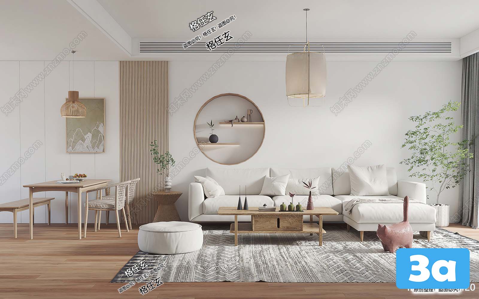 This 3D scene features a modern living room with stylish furniture and contemporary decor. The design showcases a blend of comfort and elegance, perfect for interior design inspiration.