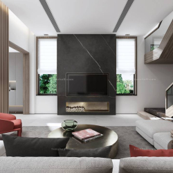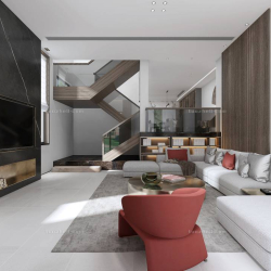 This 3D scene features a modern living room designed in a contemporary style. The interior design includes sleek furniture, stylish decor, and a harmonious color palette. Explore the perfect blend of modern aesthetics and functional living space in this captivating 3D rendering.