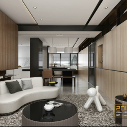 This 3D scene features a modern living room designed in a contemporary style. The room is elegantly furnished with sleek furniture and stylish decor elements. The color palette is neutral with pops of color adding visual interest. Perfect for showcasing modern interior design concepts.