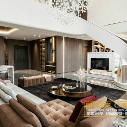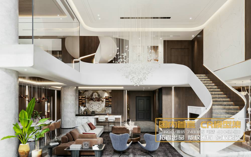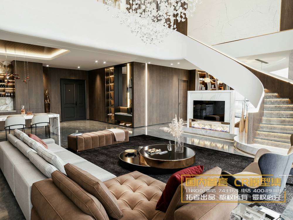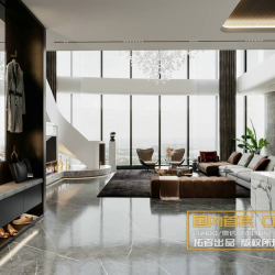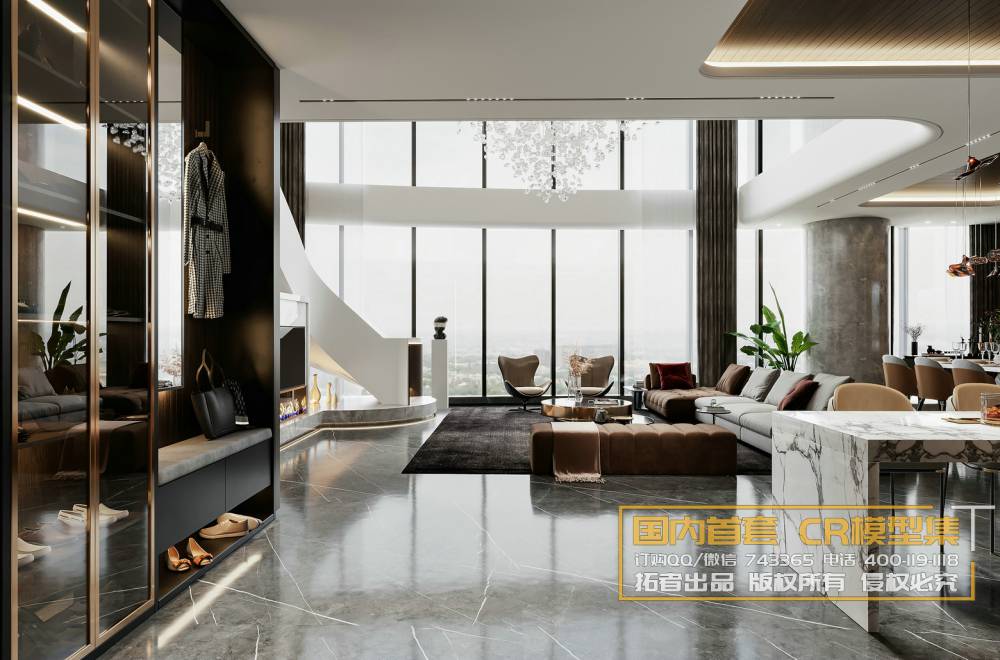 This 3D scene features a modern living room designed in a contemporary style. The room is elegantly furnished with stylish furniture and decor, creating a cozy and inviting atmosphere. Explore the intricate details of the interior design and get inspired for your own home decor projects.