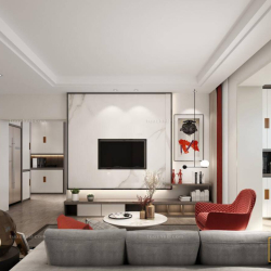 This 3D scene features a modern living room designed in a contemporary style. The interior design includes sleek furniture, stylish decor, and a harmonious color palette. Explore the perfect blend of modern aesthetics and functional living space in this captivating 3D rendering.