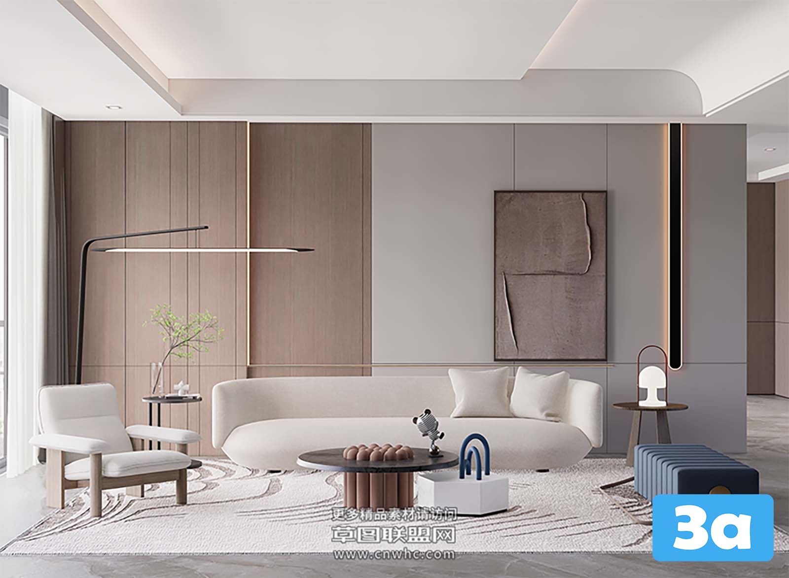This 3D scene features a modern living room with a contemporary design aesthetic. The space is elegantly furnished with sleek furniture and stylish decor elements. The color palette is neutral with pops of color to create a vibrant atmosphere. The design focuses on a balance between style and functionality, offering a comfortable and visually appealing living space.