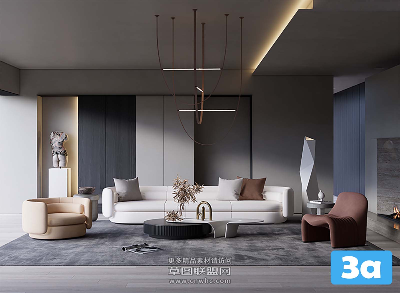 This 3D scene features a modern living room interior design created in SketchUp. The room is elegantly furnished with contemporary furniture and decor, showcasing a sleek and stylish aesthetic. The design includes a comfortable sofa, coffee table, rug, and decorative elements. The lighting and color scheme enhance the overall ambiance of the space, creating a welcoming and cozy atmosphere.
