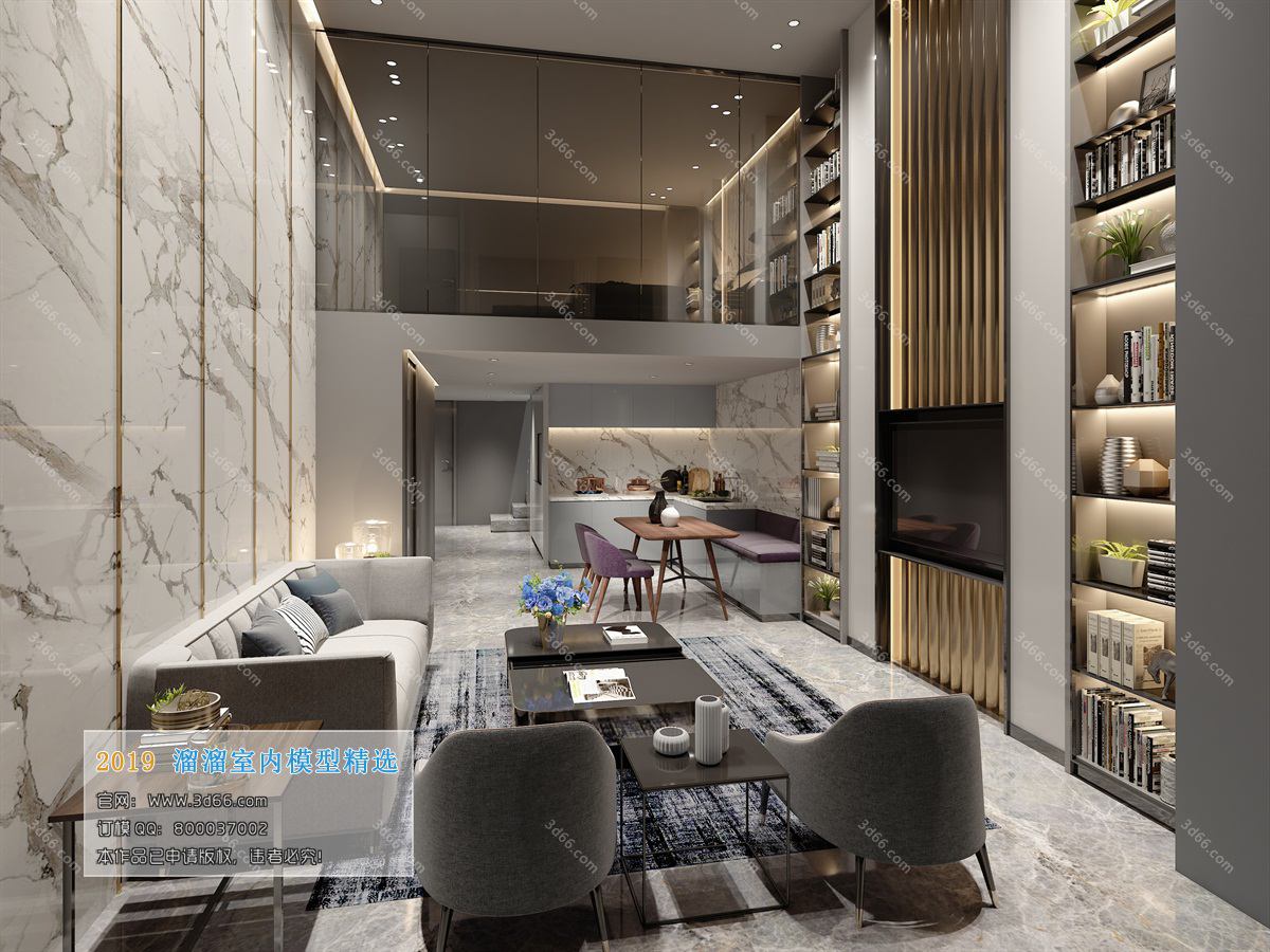 This 3D scene showcases a modern living room space designed in a contemporary style. The room features sleek furniture, clean lines, and a minimalist aesthetic. Explore the details of this interior design concept and get inspired for your own living space projects.