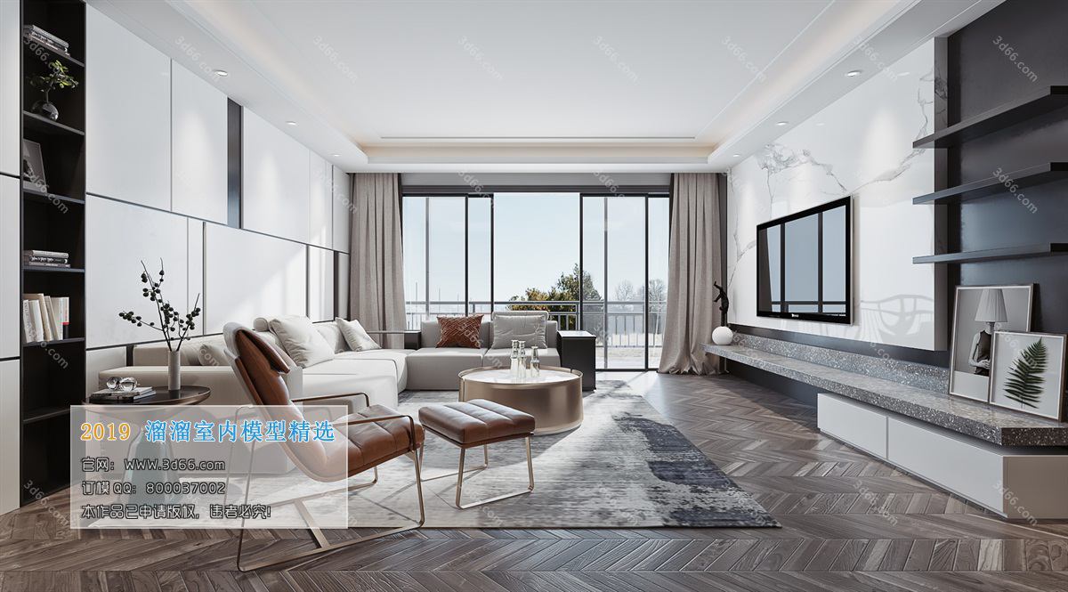This 3D scene showcases a modern living room space designed in a contemporary style. The interior features sleek furniture, clean lines, and a minimalist aesthetic. Explore the design elements and layout of this space for inspiration in your own interior design projects.