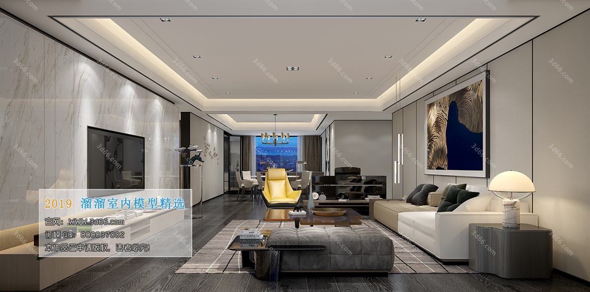 This 3D scene showcases a modern living room space designed in a contemporary style. The room features sleek furniture, clean lines, and a minimalist aesthetic. Explore the design details and layout of this space to gather inspiration for your own interior design projects.