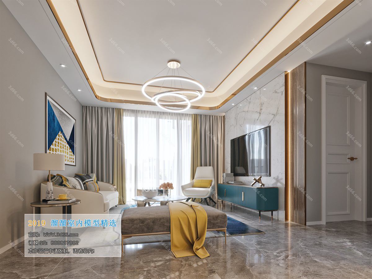 This 3D scene showcases a modern living room space designed in a contemporary style. The room features modern furniture, decor elements, and a stylish layout. Explore the intricate details of this interior design concept.