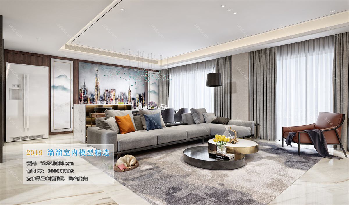 This 3D scene showcases a modern living room space designed in a contemporary style. The room features sleek furniture, clean lines, and a minimalist aesthetic. Explore the details of this interior design concept and get inspired for your own living space projects.