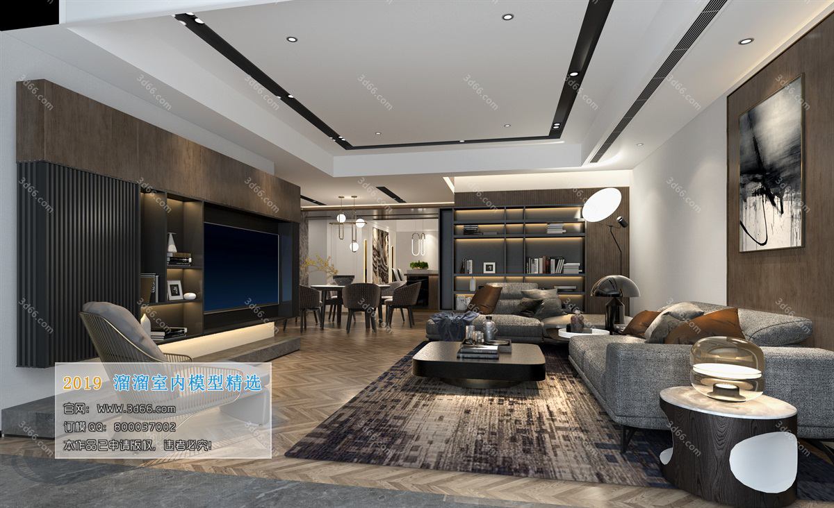 This 3D scene showcases a modern living room space with contemporary furniture and decor. Experience the sleek design and layout of this stylish interior setting. Perfect for those looking for inspiration in home decor and interior design projects.