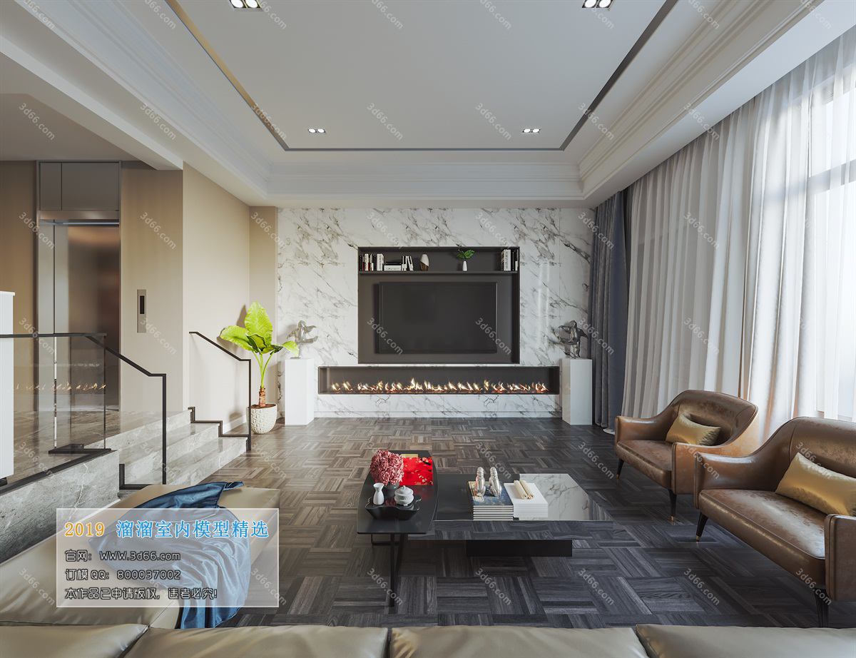 This 3D scene showcases a modern living room space designed in a contemporary style. The interior features sleek furniture, clean lines, and a minimalist aesthetic. Explore this preview to get inspiration for your own interior design projects.