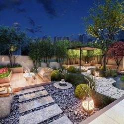 This Sketchup 3D scene features a modern roof garden design, perfect for architectural visualization projects. The contemporary rooftop garden layout includes various elements such as seating areas, planters, and greenery. Download this 3D model to enhance your architectural designs and presentations.